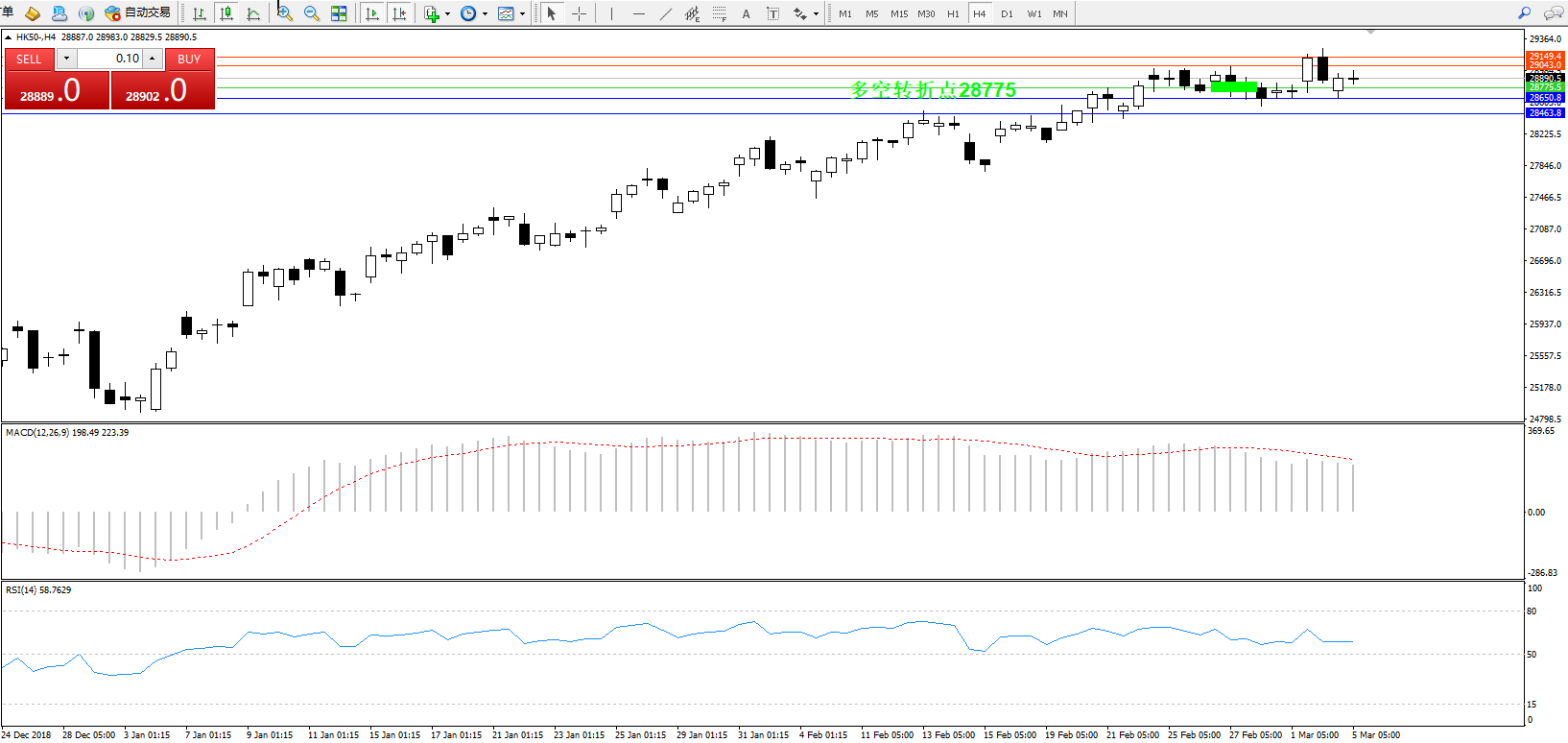 香港恒生指数低开后震荡回升,逐渐收复跌幅,一度转涨。截至收盘,恒指微跌0.01%,报28961.60点。十三届全国人大二次会议5日上午9时在人民大会堂开幕,听取国务院总理李克强关于政府工作的报告。报告指出,今年经济社会发展的主要预期目标是,国内生产总值增长6%-6.5%。报告还表示,今年将制造业等行业现行16%的税率降至13%,将交通运输业、建筑业等行业现行10%的税率降至9%;保持6%一档的税率不变,但通过采取对生产、生活性服务业增加税收抵扣等配套措施,确保所有行业税负只减不增。据摩根士丹利的数据,减税规模总计可达8000亿人民币。