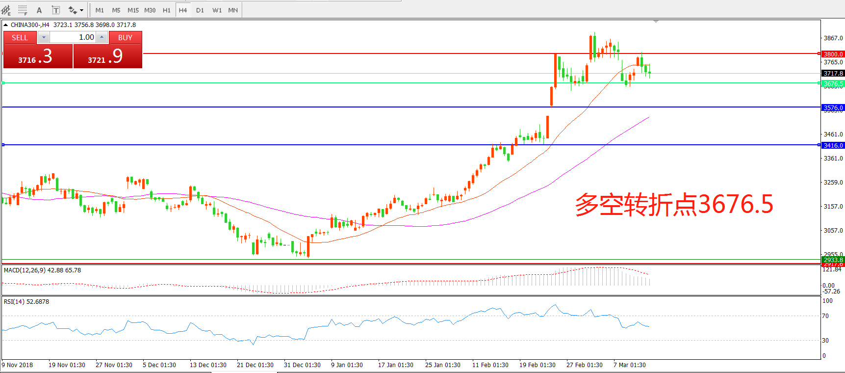 4小时图看,CHINA300中华指数高位出现震荡,虽然3800附近遇阻后出现回落,但整体形态依然偏多,均线系统呈多头排列, MACD红柱缩减,日内震荡上升概率较大。