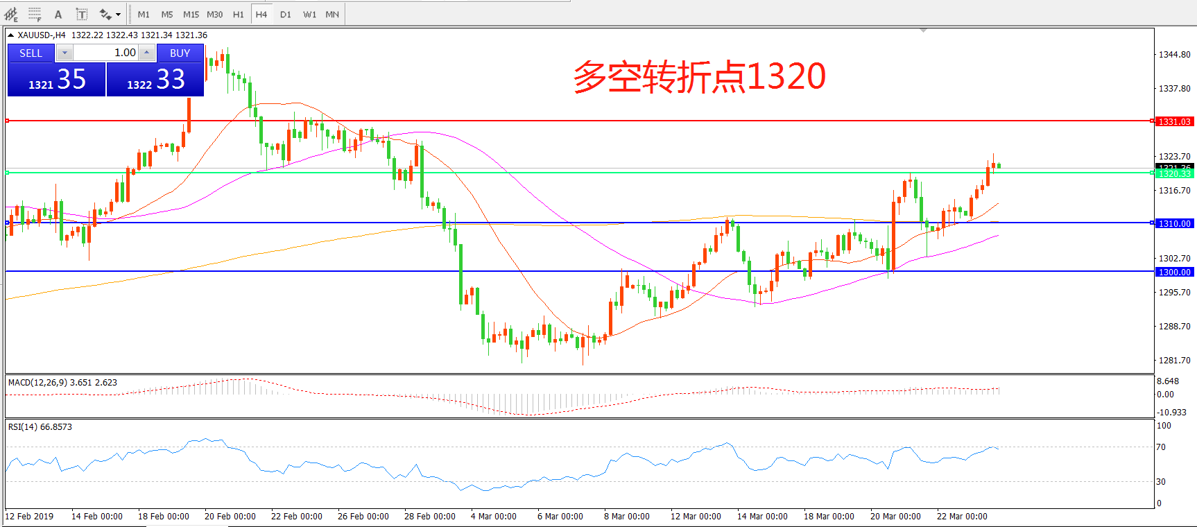 周一(3月25日)全球负利率债券名义值超过10亿美元,上周五德国10年期国债收益率近两年半来首次跌为负,美国3个月和10年期国债的息差2007年以来首次倒挂。英国脱欧方面,事态继续恶化;成千上万的民众在伦敦市中心举行抗议示威,要求就脱欧协议举行第二次公投。抗议的组织者说,参加的人数超过百万,与2003年参加反战游行的人数不相上下。而现货黄金周一强势上涨,美市盘中最高上探至1322.40美元/盎司,刷新2月28日以来高位,重返1320关口。