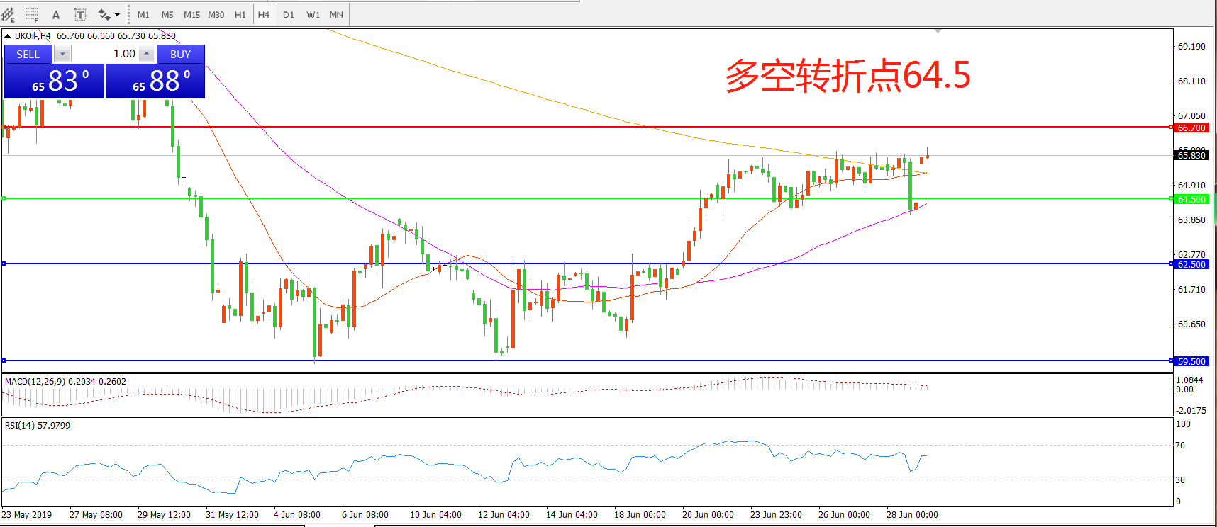 在周末大阪G20会议的中美元首会晤中,美方表示不再对中国出口产品加征新的关税,两国经贸团队将就具体问题进行讨论。 中美贸易摩擦的缓和有利于缓解市场关于经济放缓的担忧,利好油价。布伦特原油开盘后迅速涨至逾66美元/桶,截止发稿前收报65.81美元/桶,而欧佩克将于今日开始在维也纳举行OPEC大会,该会议将决定该组织是否继续减产甚至加大减产力度,这场会议的结,将成为短期油价走势的风向标。周末有消息称自俄罗斯总统普京表示与沙特同意将减产协议至少延长至今年年底,沙特能源大臣法利赫表态称最可能的结果是延长减产9个月。