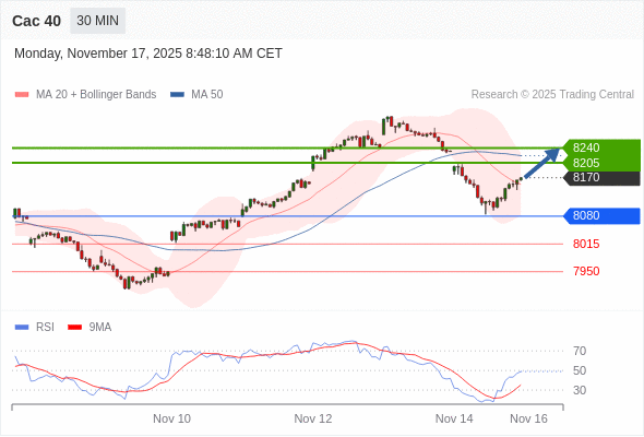 Cac 40 当日内: 超短线(当日内)支撑位在8080附近。