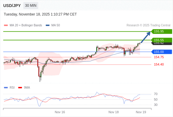 在 155.00 之上,看涨,目标价位为 155.55 ,然后为 155.95 。
