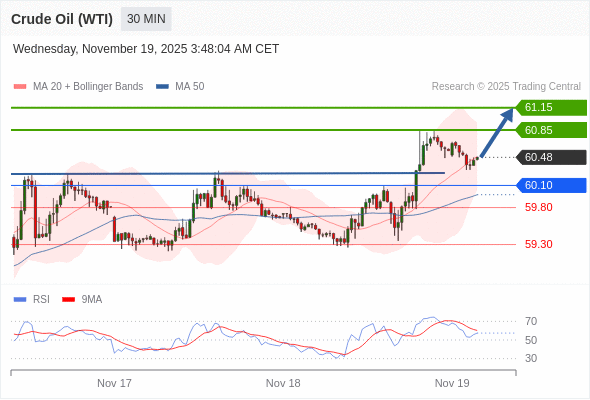 在 60.10 之上,看涨,目标价位为 60.85 ,然后为 61.15 。