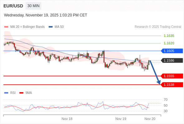 在 1.1605 之下,看跌,目标价位为 1.1565 ,然后为 1.1550 。