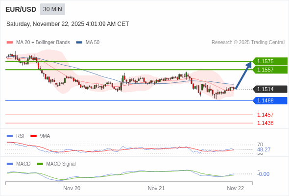 欧元/美元 当日内 : 有上涨的可能,目标价位定在 1.1575 。