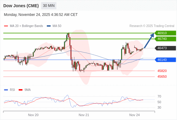 在 46140 之上,看涨,目标价位为 46740 ,然后为 46910 。