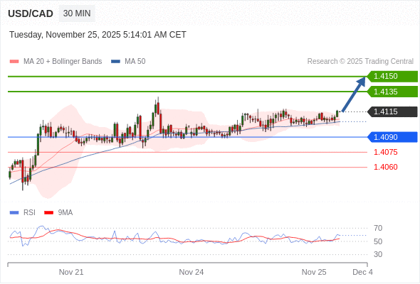 在 1.4090 之上,看涨,目标价位为 1.4135 ,然后为 1.4150 。