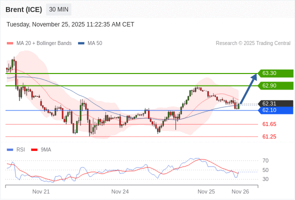 在 62.10 之上,看涨,目标价位为 62.90 ,然后为 63.30 。