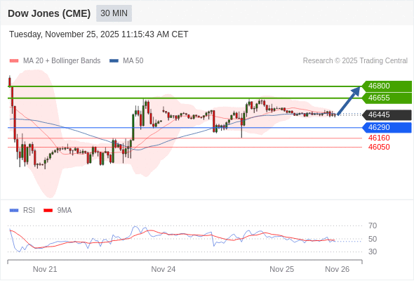在 46290 之上,看涨,目标价位为 46655 ,然后为 46800 。