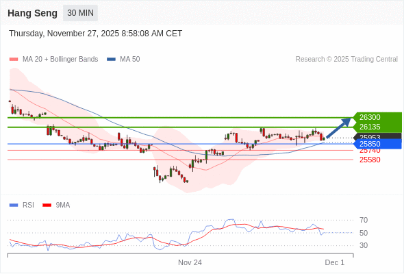 恒生指数 当日内: 在25850之上,看涨。