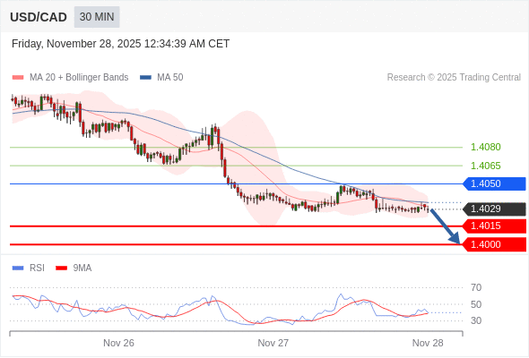 在 1.4050 之下,看跌,目标价位为 1.4015 ,然后为 1.4000 。