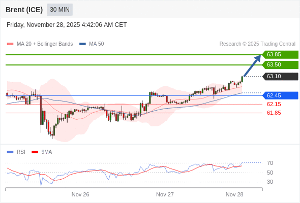 在 62.45 之上,看涨,目标价位为 63.50 ,然后为 63.85 。