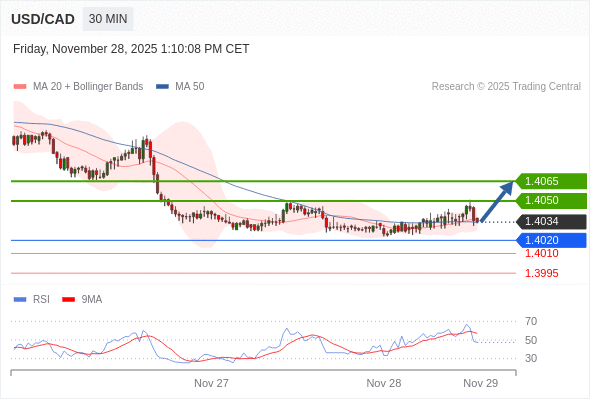 在 1.4020 之上,看涨,目标价位为 1.4050 ,然后为 1.4065 。