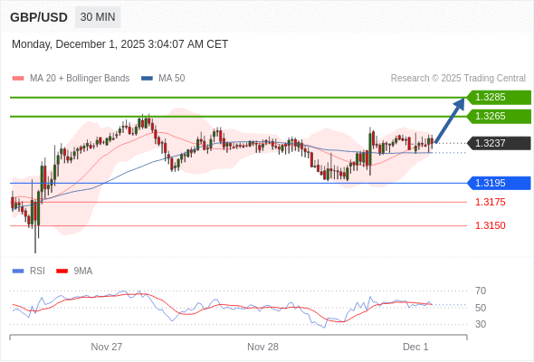 在 1.3195 之上,看涨,目标价位为 1.3265 ,然后为 1.3285 。