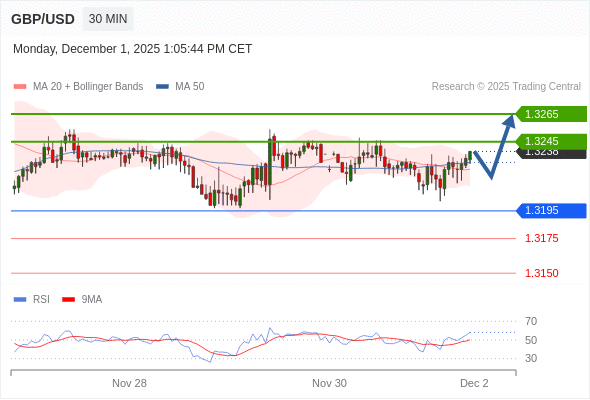 在 1.3195 之上,看涨,目标价位为 1.3245 ,然后为 1.3265 。