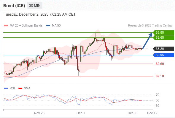 在 62.95 之上,看涨,目标价位为 63.65 ,然后为 63.85 。