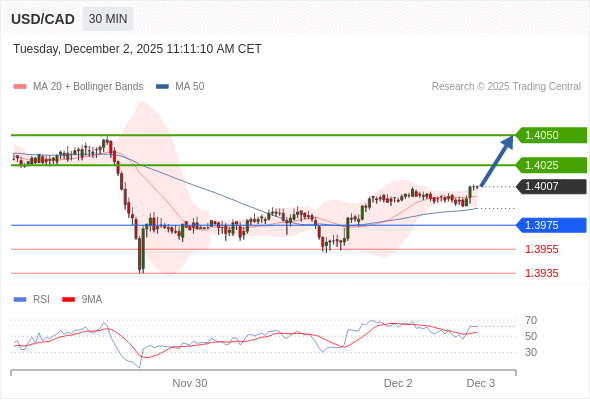 在 1.3975 之上,看涨,目标价位为 1.4025 ,然后为 1.4050 。