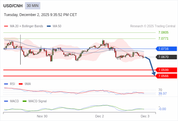 美元/人民币 当日内 : 看跌,在 7.0716 之下。