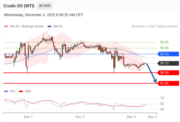 在 59.10 之下,看跌,目标价位为 58.30 ,然后为 57.85 。