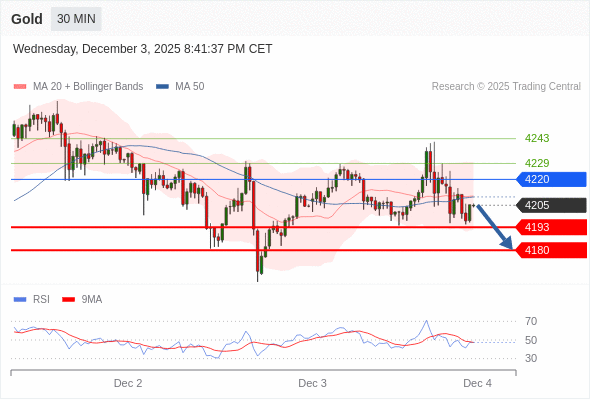 在 4220 之下,看跌,目标价位为 4193 ,然后为 4180 。