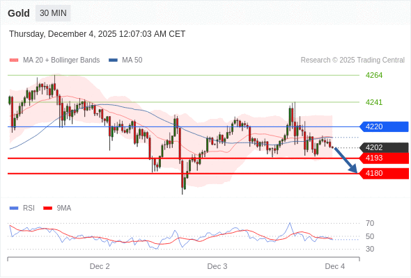 在 4220 之下,看跌,目标价位为 4193 ,然后为 4180 。