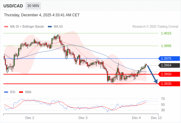 在 1.3975 之下,看跌,目标价位为 1.3950 ,然后为 1.3935 。