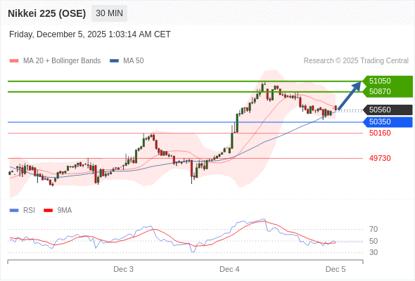 在 50350 之上,看涨,目标价位为 50870 ,然后为 51050 。