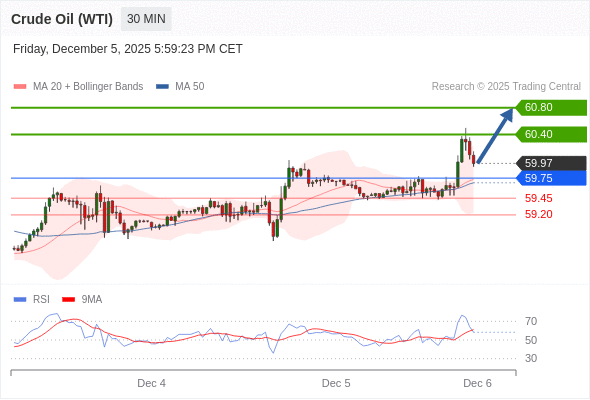 在 59.75 之上,看涨,目标价位为 60.40 ,然后为 60.80 。