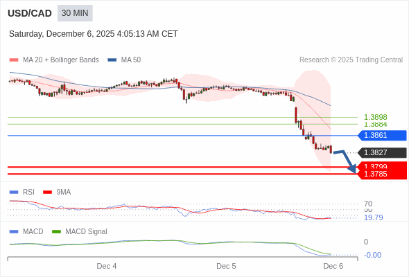 技术点评: RSI技术指标小于30。在这种情况下,说明有很强的下跌趋势,或者意味着处在超卖的状态下,可能会有向上的反弹。我们将观察RSI技术指标是否出现背离现象。 MACD技术指标处在其信号线之下看空。 配置为负。 此外,价位低于其20天及50天移动平均线 ( 分别位于1.3874 和1.3921 )。