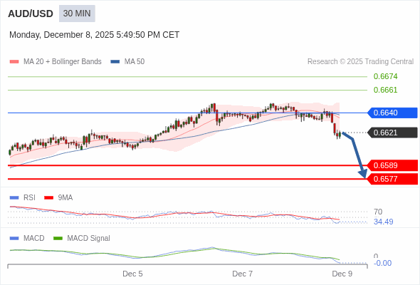 澳元/美元 当日内 : 看跌,在 0.6640 之下。