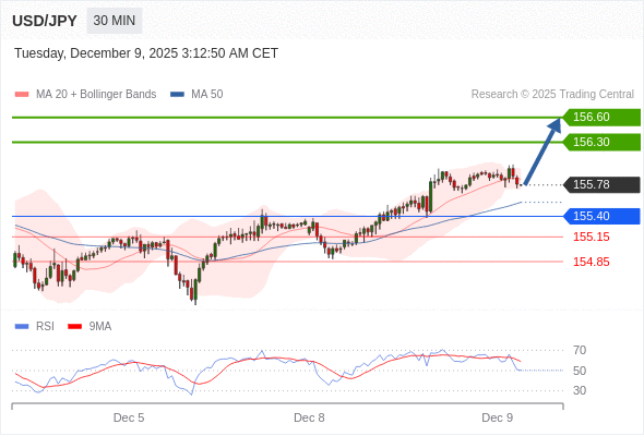 在 155.40 之上,看涨,目标价位为 156.30 ,然后为 156.60 。