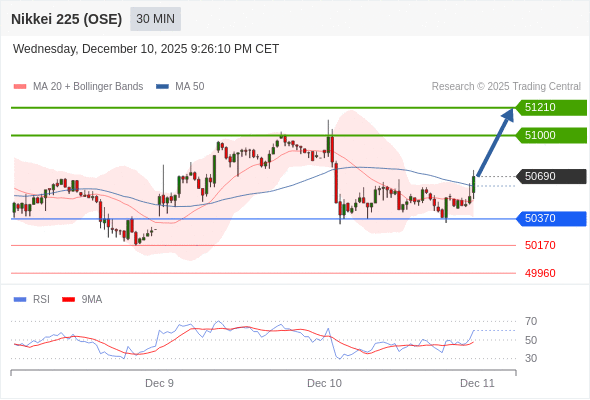 在 50370 之上,看涨,目标价位为 51000 ,然后为 51210 。