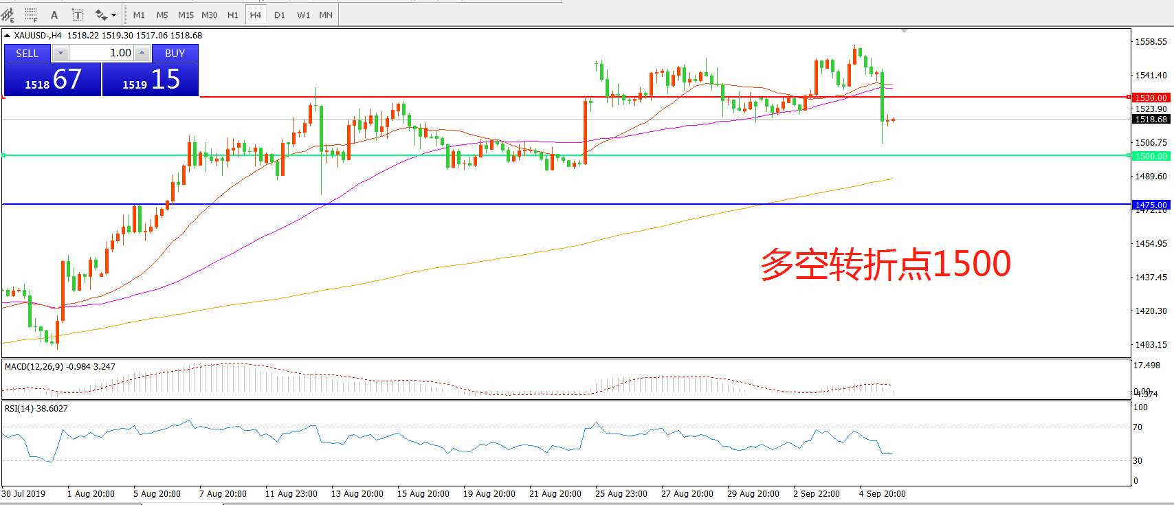 同时有“小非农”之称的美国8月ADP就业人数增加19.5万人,远超14.9万人的预期,黄金受到打压,日内大跌一度超40美元,触及1506.2美元/盎司的日低,是近两周最低水平,跌幅超2.5%,最终收报1518.40美元/盎司,创下两年多以来最大单日跌幅。但世界黄金协会(WGC)指出,全球黄金ETF持有量净流入了60亿美元,总持有量增加了122吨至2733吨,距离历史最高水平已经非常接近了,这一数据表明市场对金价走势依然看好,本周最重磅的消息依然是周五的非农就业报告和周六凌晨美联储主席鲍威尔的讲话,务必重点关注。