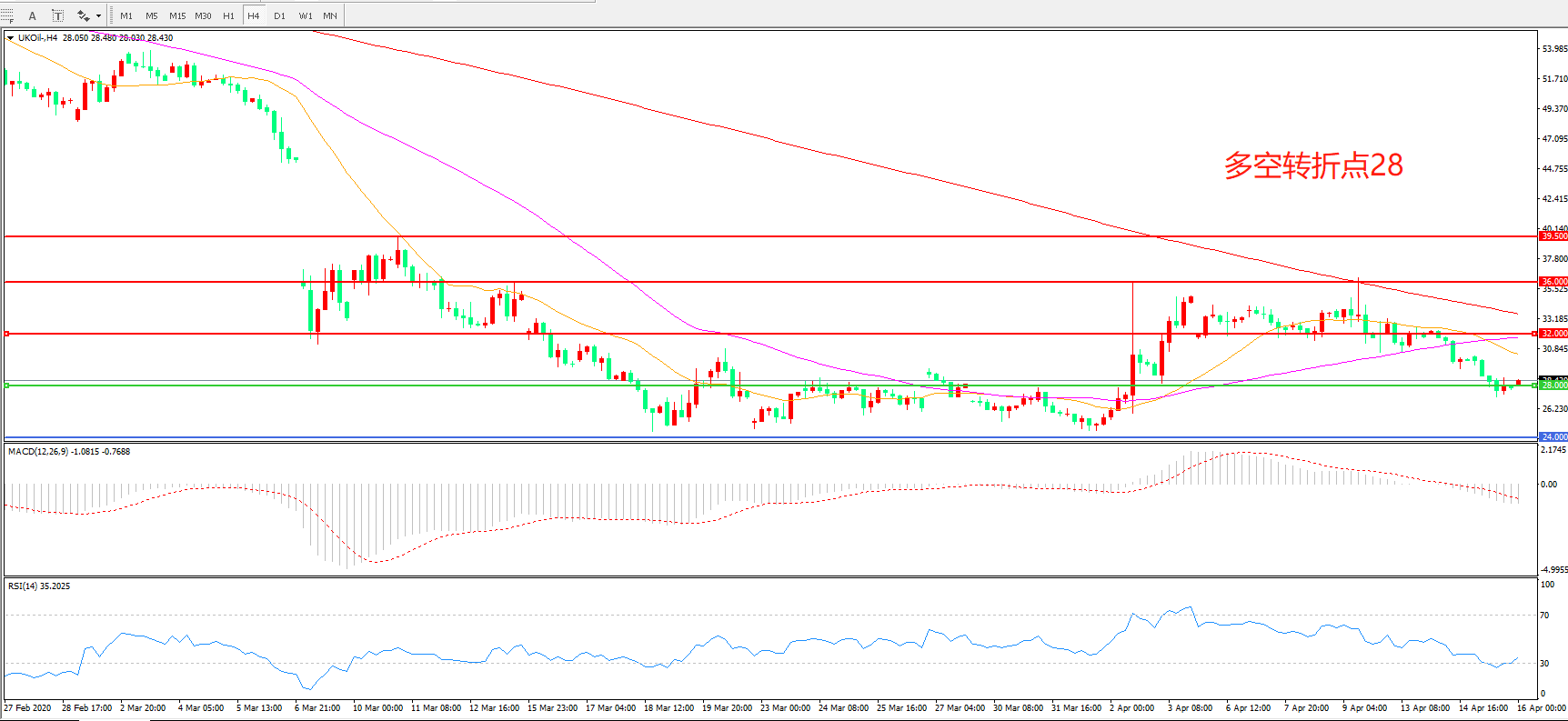 4小时图看,油价跳空高开,低迷状况有所缓解, MACD绿柱缩短,RSI指标走平,日内延续震荡概率较大。