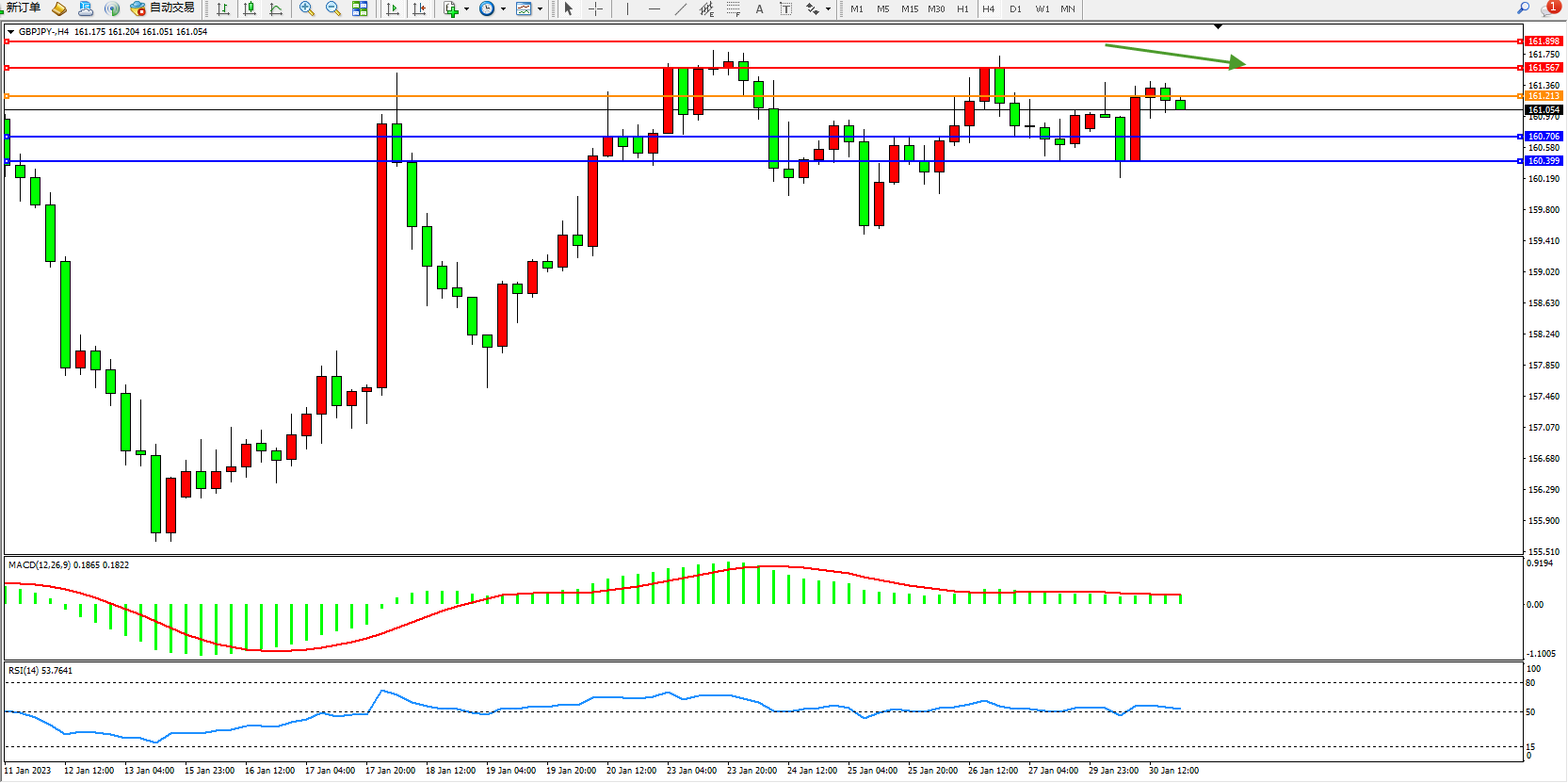 交易策略:161.213下方看跌,目标161.706、160.399