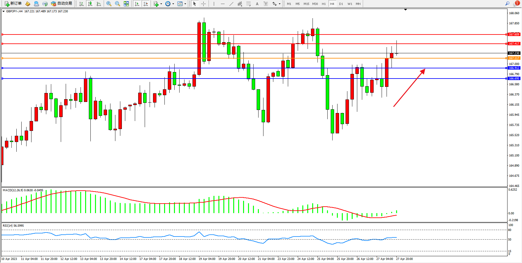 交易策略:167.117上方看涨,目标167.417 167.609