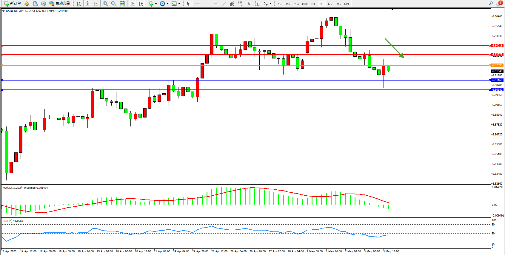 美元人民币USDCNH——4小时K线图显示: