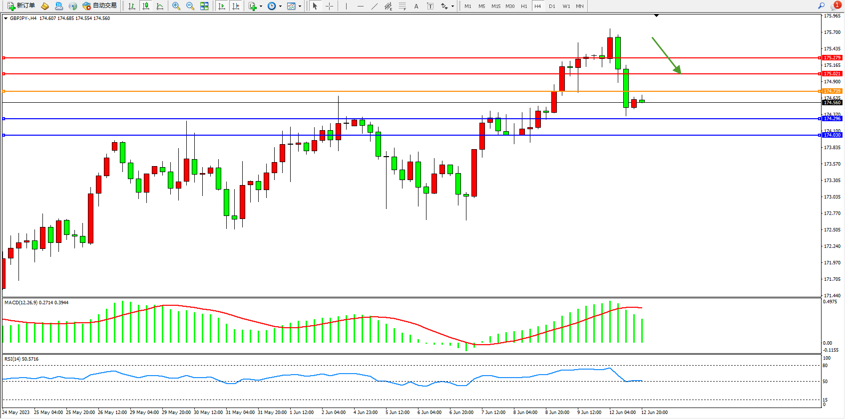 交易策略:174.739下方看跌,目标174.296 174.030