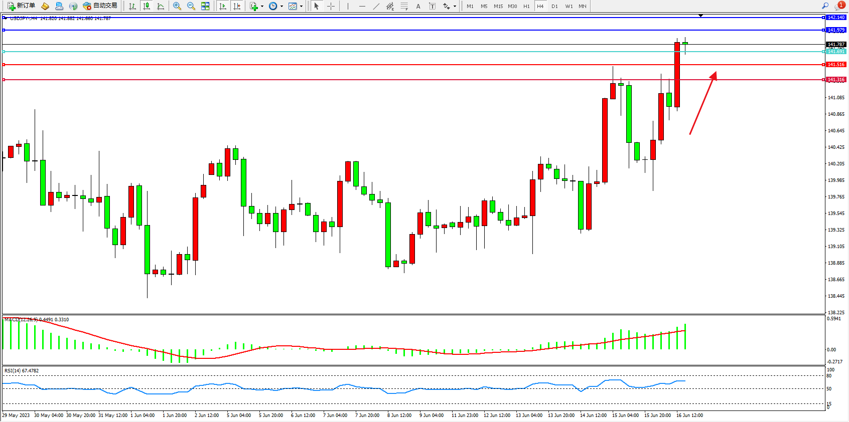 备选策略:141.691下方看跌,目标141.516 141.316