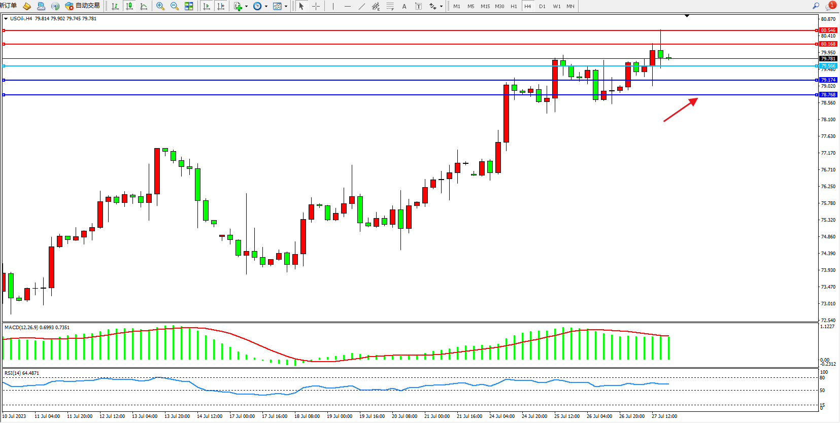 4小时图看:多头动力高位持续震荡向上移动,短期看涨情绪态势良好,市场多头不断攀升中,MACD指标处于多头区域高位整理,RSI指标处于多头区域维持整理;