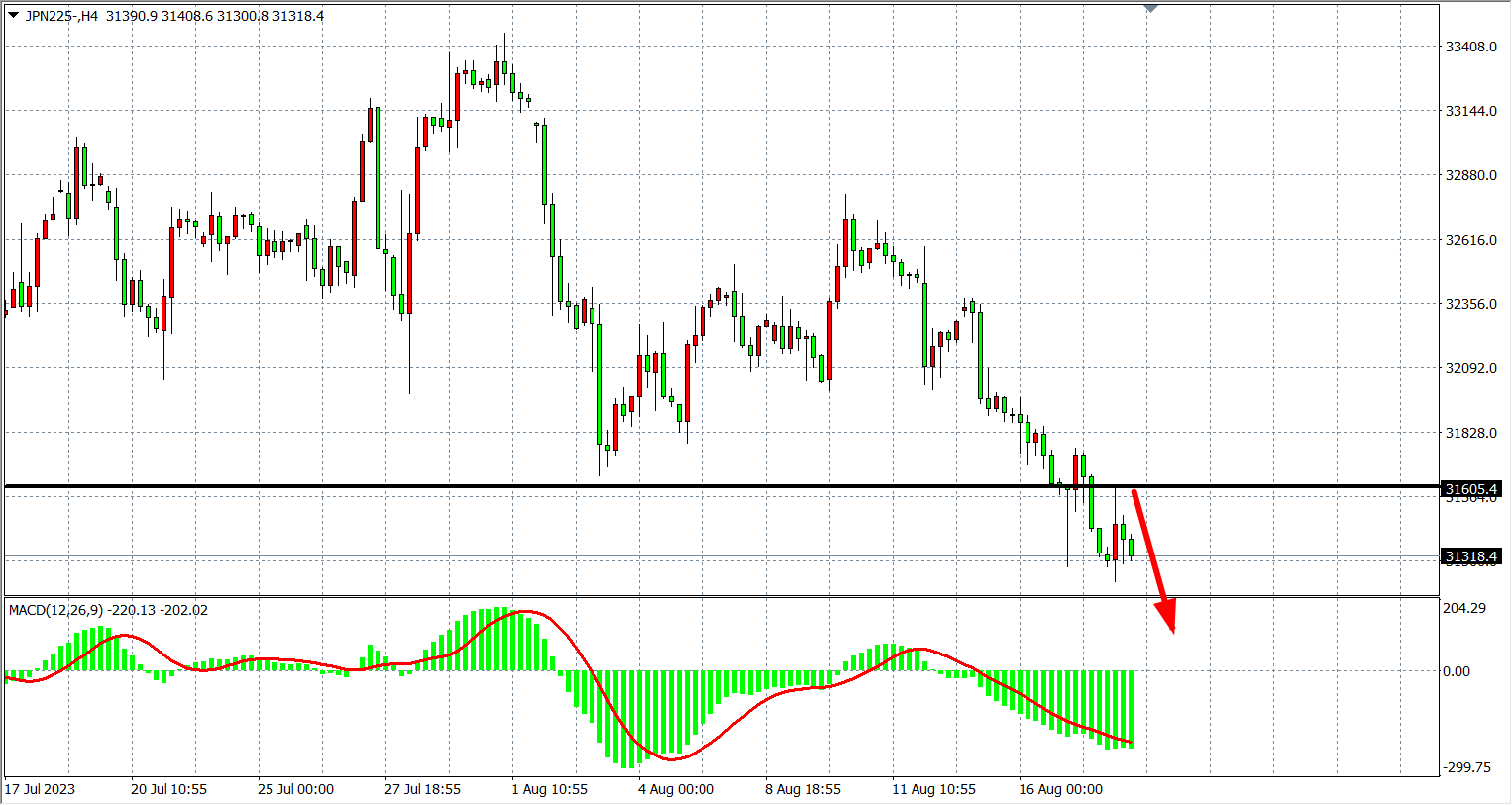 4小时图看,日经指数反弹31600受阻,MACD量能在零轴下,空头趋势延续,阻力关注31600-32000。