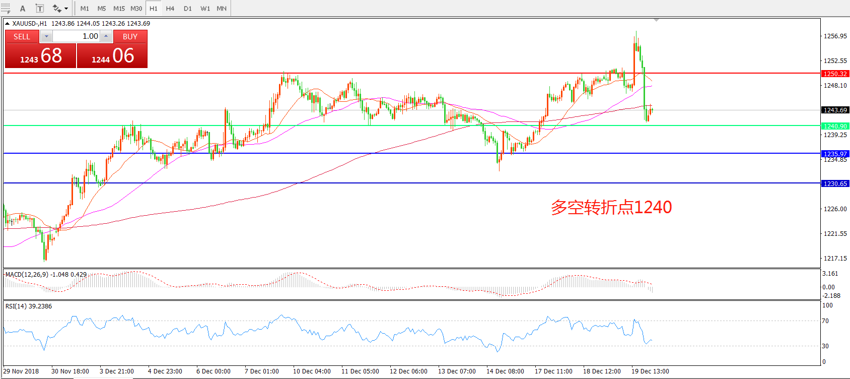 现货黄金周三(12月19日)在美联储宣布加息25个基点以后大幅下挫,失守1250关口,但整体走势仍在多头形态之内。北京时间12月20日3:00,美联储宣布将美国联邦基金利率调升25个基点至2.25%-2.5%区间,实现年内第四次加息,符合市场预期。但在随后的新闻发布会上鲍威尔讲话总体偏鸽。首先,在中性利率的表述上再一次表明美联储加息接近尾声。其次,鲍威尔提到经济趋弱的证据包括海外经济增长迟滞和金融市场波动,美联储也在关注关键的性风险包括英国脱欧、意大利与欧盟谈判预算。美股的可以看出美国经济本身的动力也不足,实际上,美联储已经放慢了脚步。