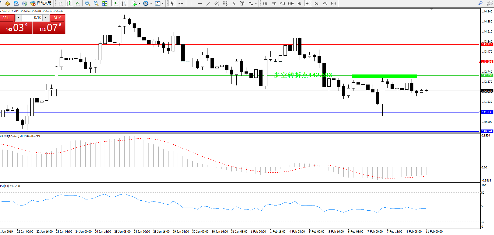 交易策略:142.593下方看跌,目标141.238140.544