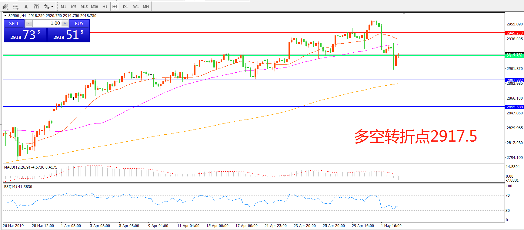 4小时图看,标普500冲高之后快速回落,21均线有下穿55均线形成死叉迹象,MACD绿柱增加,日内延续下跌概率较大。