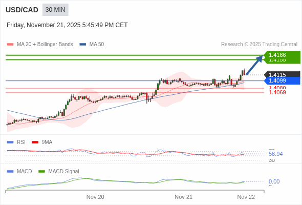 美元/加元 当日内 : 看涨,当 1.4099 为支撑位。