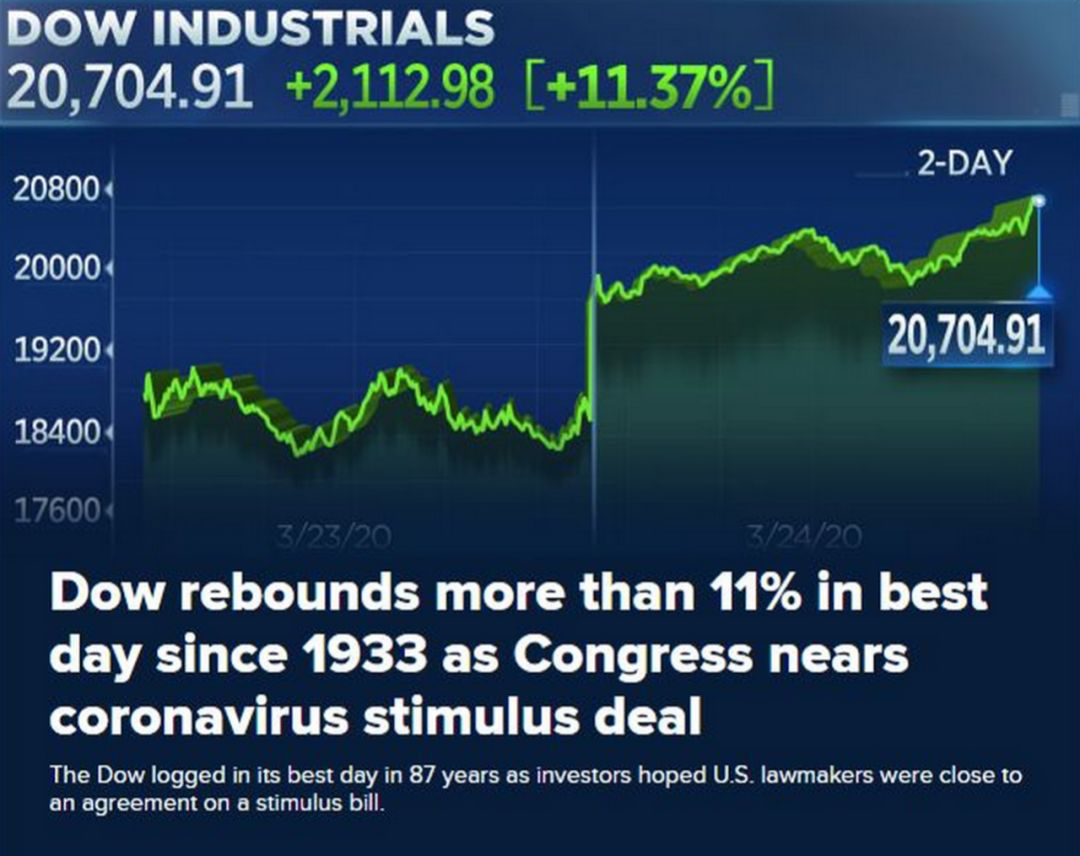 昨夜美股道琼斯指数暴涨超2100点,一天的涨幅就超过了11%,创下1933年来最大涨幅。标普500指数涨幅达9.38%,创2008年10月份以来最大单日涨幅,报2447.33点。纳斯达克综合指数涨幅8.12%,创逾一周最大单日涨幅,报7417.86点。