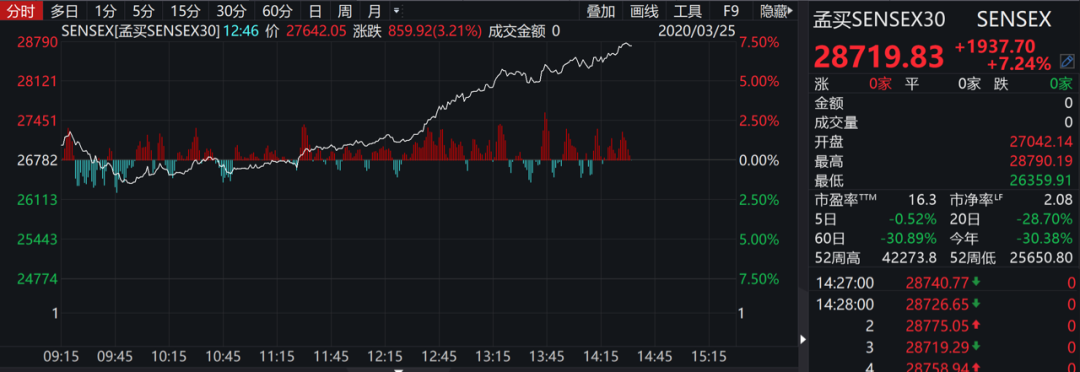 印度SENSEX指数涨幅扩大至7%,为2009年以来最大涨幅。