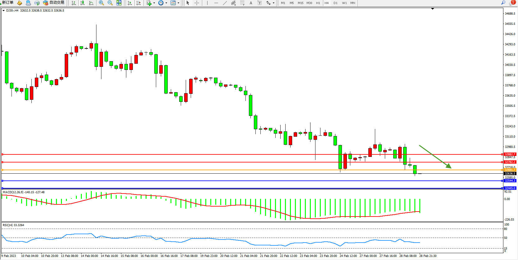 道琼斯指数2月28日(周二)收盘下跌234.11点,跌幅0.71%,报32654.98点;美国1月商品贸易逆差温和扩大,进出口双双稳健增长。1月份美国商品贸易逆差扩大2.0%,至915亿美元,商品进口增加88亿美元,达到2653亿美元,商品出口增加70亿美元至1738亿美元。