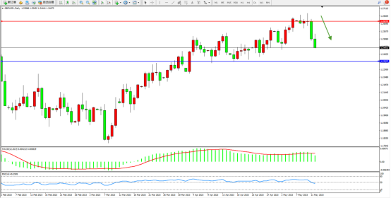 高位空头动力急速下挫,短期跌势或将持续,市场整体空头情绪笼罩,短期有继续向下移动态势,上方压制关注1.26243附近,低位支撑关注1.23537附近,MACD指标处于多头区域缓慢下移,RSI指标维持震荡回撤至50均衡线下侧徘徊,如图:
