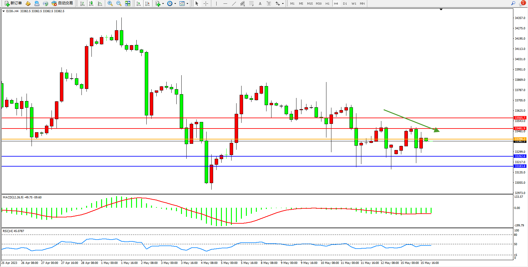 道琼斯指数5月15日(周一)收盘上涨49.78点,涨幅0.15%,报33350.40点;美国总统拜登和国会共和党人进入债务上限谈判的关键一周,双方面临深刻的党派分歧。拜登表示,预计将在周二(5月16日)与国会领导人碰面,并对就提高美国31.4万亿美元借贷上限达成协议持乐观态度。
